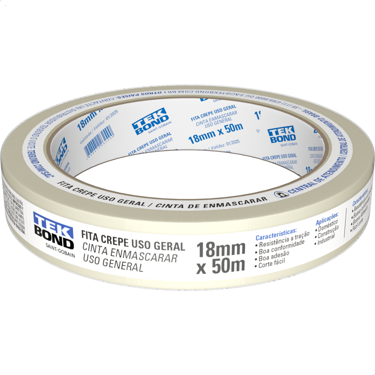 Resistente ao sol e à umidade, a Fita Crepe da Tekbond é aquele item indispensável para os mais diferentes usos. É o produto ideal para proteger, delimitar, fazer marcações, colagens e reparos temporários. Muito usada também na técnica de cartonagem e para fechar embalagens temporariamente.