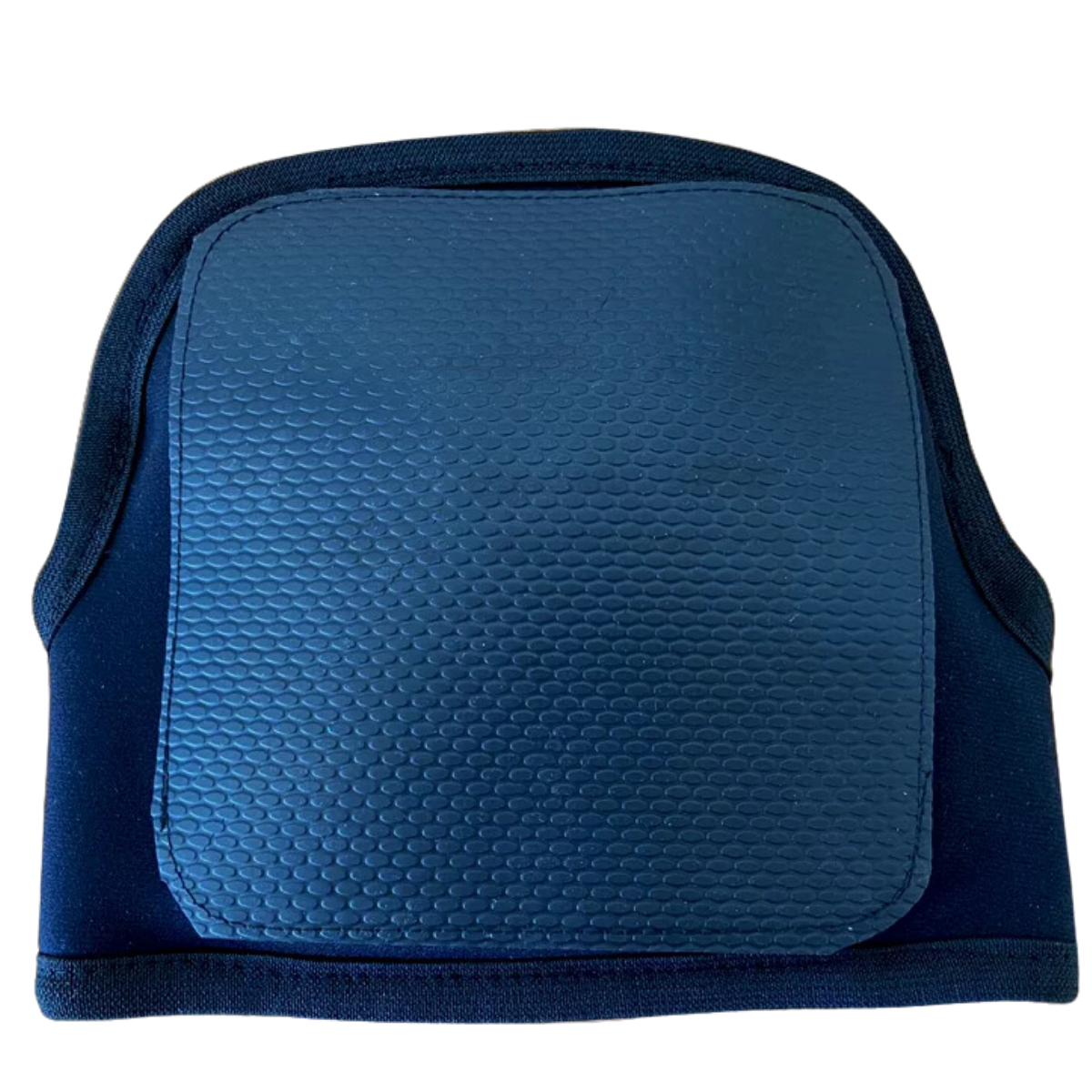 Desenvolvido em material resistente com acabamento frontal em manta de borracha arroz canelada com espessura de 2,5 mm, corpo e alça em tecido neoprene preto de 1,5 mm, alça contém velcro áspero e macio de 50 mm de largura, no interior placa de EPDM de 15 mm de espessura. Acabamento em viés de gorgurão de 25 mm preto.