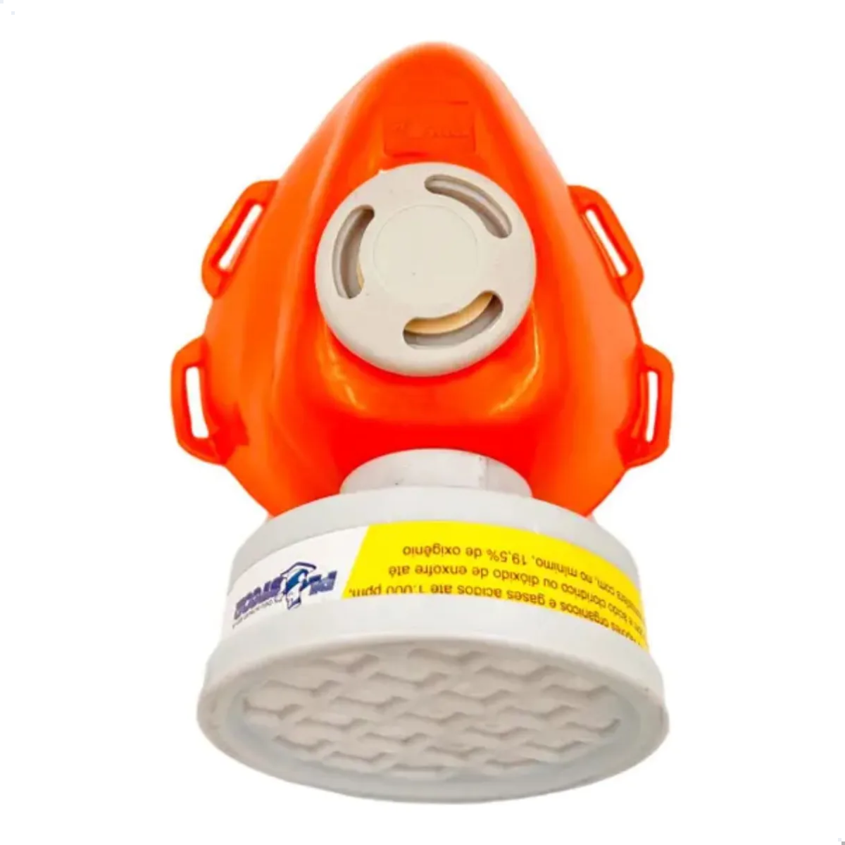 Peça semi facial confeccionado em termoplástico atóxico, um conector para fixação dos elementos filtrantes, uma válvula de inalação e uma válvula de exalação e quatro alças para fixação das presilhas plásticas com regulagem e dois tirantes elásticos para fixação do respirador na cabeça.