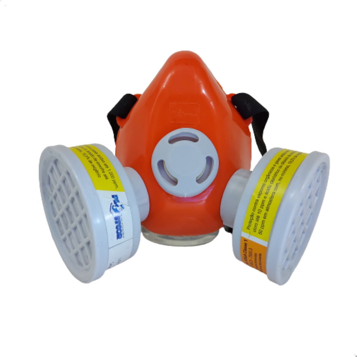 Peça semi facial confeccionado em termoplástico atóxico, dois conectores para fixação dos elementos filtrantes, duas válvulas de inalação e uma válvula de exalação e quatro alças para fixação das presilhas plásticas com regulagem e dois tirantes elásticos para fixação do respirador na cabeça.