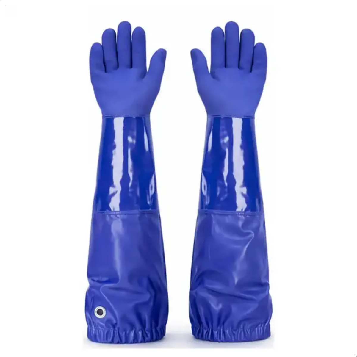 Luva de PVC com manga longa soldada (Total 66cm). Proteção química (Tipo A) e biológica até o ombro. Ideal para imersão em tanques, saneamento e manuseio de tambores. Forro em algodão.
