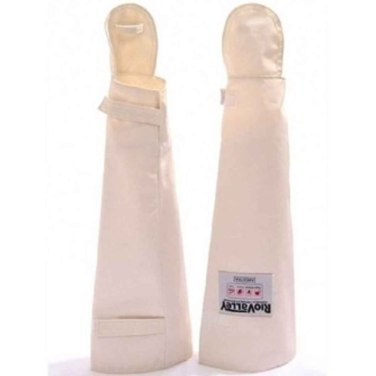 Mangote de segurança confeccionado em tecido de algodão, com tratamento retardante a chamas, revestido em silicone, com punho em malha e proteção do dorso, costurado em linhas de para-aramida.