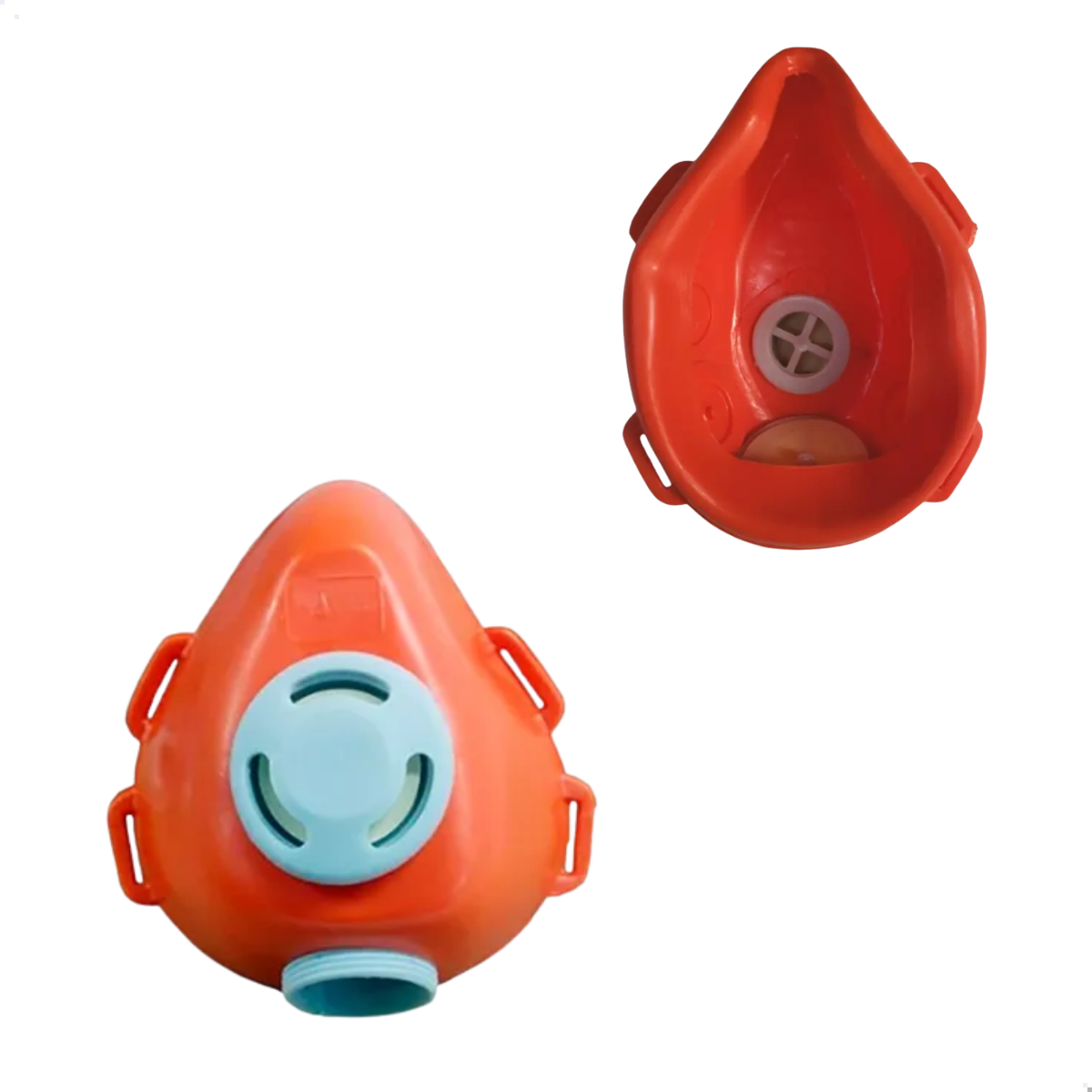 Peça semi facial confeccionado em termoplástico atóxico, um conector para fixação dos elementos filtrantes, uma válvula de inalação e uma válvula de exalação e quatro alças para fixação das presilhas plásticas com regulagem e dois tirantes elásticos para fixação do respirador na cabeça.