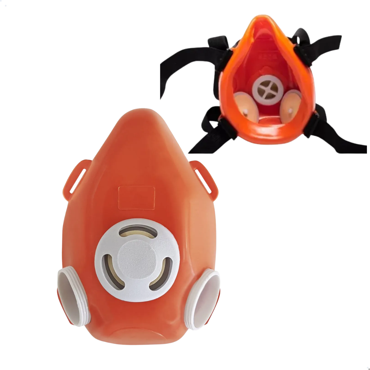 Peça semi facial confeccionado em termoplástico atóxico, dois conectores para fixação dos elementos filtrantes, duas válvulas de inalação e uma válvula de exalação e quatro alças para fixação das presilhas plásticas com regulagem e dois tirantes elásticos para fixação do respirador na cabeça.