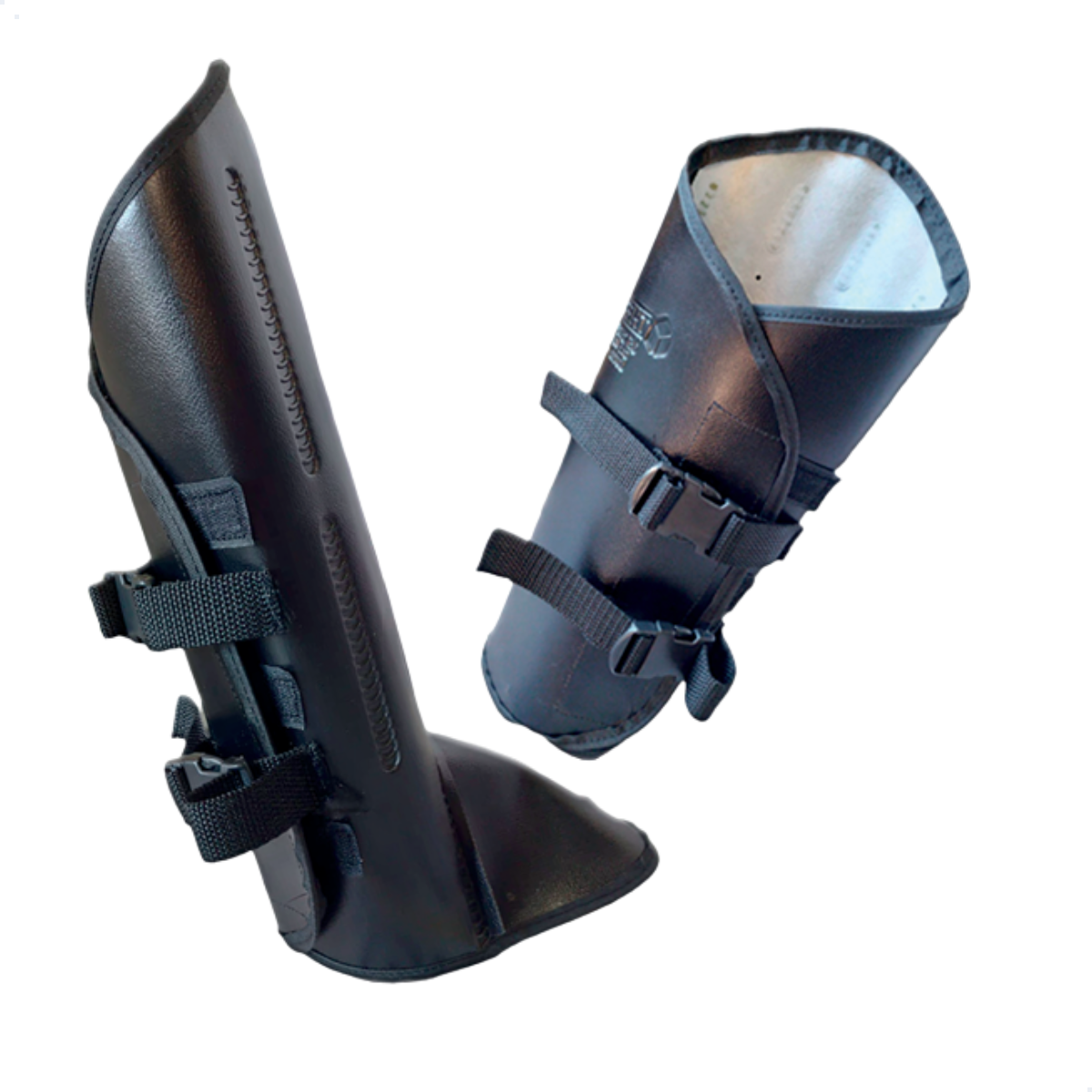 Perneira de segurança confeccionada e forrada com material sintético, três talas de polipropileno frontais para proteção, fechamento através de velcro e fivela.