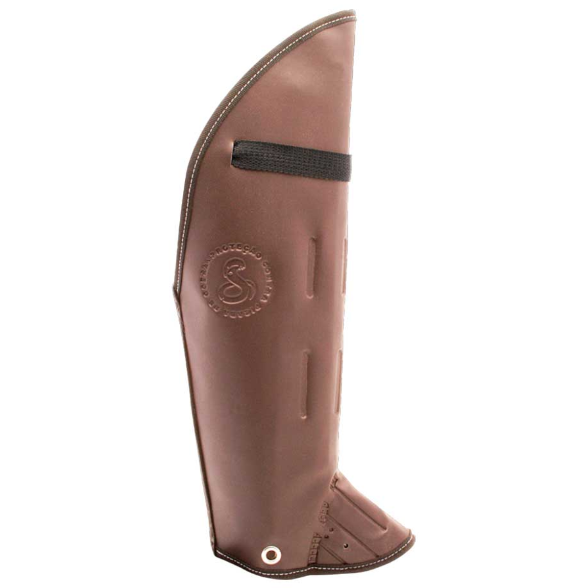 Perneira em couro sintético duplo, costura eletrônica, com proteção de joelho, sem orifícios laterais para