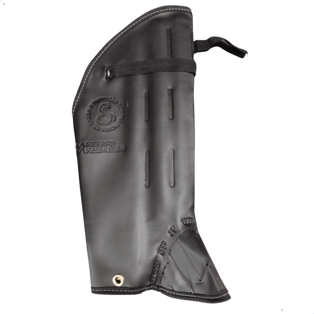Perneira em couro sintético duplo, costura eletrônica, com proteção de joelho, sem orifícios laterais para